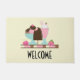 Un paillasson de bienvenue sur le thème de la crème glacée douce. Illustré avec un bar à crème glacée au chocolat, un sundae à 3 boulettes avec une cerise sur le dessus, et un flotteur à fraise avec de la crème fouettée. Petites fraises et cerises. Arrière - plan jaune pâle. Rafraîchissant, gourmandises chaudes en été.