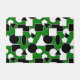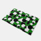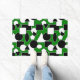 Ce tapis de porte a une conception Bauhaus de triangles, cercles, rectangles et pentagons en noir et blanc sur un champ de vert.