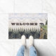Peut PERSONNALISER ce tapis de porte d'ours! Artiste : Harry Bullock Webster - Bear on Cliff. Aquarelle. vers 1874-1880. L'image est une peinture impressionniste d'un ours noir debout sur une falaise surplombant une forêt verte foncée avec des sommets enneigés s'élevant au loin. Une partie de l'image est répétée à travers le tapis de porte pour remplir l'espace horizontal.