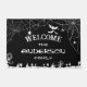 Tapis Éffrayant d'Halloween noir et blanc personnalisé avec araignées, arbres Déplaisants, chauves-souris et fantômes. Réglez votre décor de maison d'Halloween avec ce tapis de portes d'Halloween familial personnalisé ! Ce design éffrayant en noir et blanc présente des toiles d'araignées complexes et des araignées pendantes, des silhouettes étranges d'arbres forestiers dans un cimetière déplaisant, avec des pierres tombales, des chauves-souris volantes et des fantômes hantants. C’est la façon idéale d’accueillir les gourmands en quête de bonheur tout en ajoutant une touche festive et éffrayante à votre entrée. Customisez-le avec votre nom de famille pour le rendre unique et emmenez vos invités dans l'esprit d'Halloween dès qu'ils franchissent votre porte !