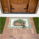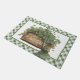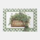 Ce paillasson fantaisiste de la Saint-Patrick représente une boîte de trèfle avec le mot "chanceux" sur le devant. Il y a une bordure verte et blanche à carreaux assortie sur le bord.
