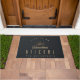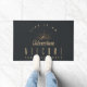 Un paillasson personnalisé qui dit Bienvenue avec votre nom. Conçu avec une illustration de couleur or sur un arrière - plan gris-noir. Conçu avec une illustration d'une montagne avec les rayons de soleil brillant vers l'extérieur de derrière. La typographie dit : La vie est une aventure explorer la découverte de rêve.