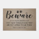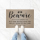 Le tapis de porte vintage drôle comportant un arrière - plan brun rustique d'effet de toile de jute, empreintes de pattes, le mot "prennent garde" dans une police élégante de calligraphie, et des énonciations humoristiques au sujet des chiens dans votre ménage !