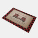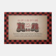 Illustration de deux paires de bottes pour randonnées adultes avec des chaussures rouges disposées en forme de coeur avec des chaussures pour bébés entre les deux. Personnalisez avec votre nom. Le poème dit, "Parce que les petites mains touchent nos sols, s'il vous plaît laissez vos chaussures à la porte" Arrière - plan est inspiré des cartons bruns et la bordure est rouge et noir buffle plaid.