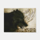 Un profil d'un loup noir solitaire passant devant un mur couleur crème de pierre qui a un noeud celtique et dragon celtique sculpté dans le mur
