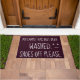 Votre tapis vient-il d'être lavé ? Es-tu heureux que toutes ces taches désagréables aient disparu ? Ensuite, vous avez besoin de ce tapis couleur prune cool qui dit "MON MOQUETTE VIENT D'ÊTRE LAVÉ. SHOES OFF S'IL VOUS PLAÎT.' en grandes lettres blanches à côté d'un visage souriant et heureux.