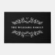 Zwarte deurmat met jouw naam omgeven door gespiegelde halfgehakte bladeren en bessen. Voeg uw initiaal toe en het jaar waarin uw familie in een elegant wit lettertype is ingesteld.