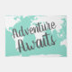 Silhouette de carte du monde blanc tendance avec l'expression "l'aventure attend" en mat de script gris.