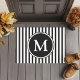 Tapis de porte avec monogramme blanc sur un motif rayé noir et blanc.