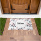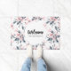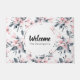 Un tapis de bienvenue personnalisé avec un nom. Conçu avec un élégant motif fait avec une aquarelle illustration de fleurs roses avec feuilles et tiges bleu-gris. Un cercle blanc superposé avec votre texte à l'intérieur.