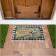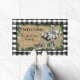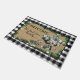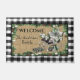 Bienvenue à vos visiteurs de Noël avec ce tapis de porte de ferme unique et festif avec un traîneau noir et blanc vintage décoré de poinsettias blanches luxuriantes, et des paquets emballés dans un chèque de buffle vert et noir brillant. L'arrière - plan burlap est entouré d'une guirlande de branches de pin avec des cônes de pins et des étoiles blanches et un motif de contrôle de buffle noir et blanc. Personnalisez avec vos propres informations.