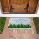 Elegant custom doormat features "Merry Christmas" and your family name on a snowy background with pine trees. Personalize with your family's last name.