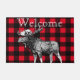Motif audacieux de plaid de contrôle de buffle en rouge et noir avec une illustration noire et blanche détaillée d'orignaux et le mot "accueil" dans une police ouverte blanche de visage au centre supérieur. Cette natte est grande pour un cabine ou un campeur !