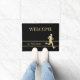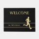 Un coureur de silhouette en or se trouve en bas à droite de ce tapis de porte. Des lignes dorées minces encadrent votre nom de famille ou tout autre texte personnalisé en or correspondant, et le champ de texte supérieur, qui est également personnalisable, dit ACCUEIL. L'image et le texte sont placés sur un arrière - plan noir.