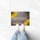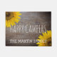 Le cadeau à la maison floral rustique de décor de pays pour des rvers, des voyageurs retirés, des jardiniers, des randonneurs, des campeurs, et des amants de nature est cette natte en bois personnalisée de texture qui indiquent les "profondément satisfaits dans le lettrage simple avec un modèle pour ajouter le nom de famille ci-dessous dans les lettres blanches et lunatiques. Contre une photo d'arrière - plan du bois rustique et affligé qui est marqué et obscurci autour des bords. Les tournesols jaunes de pays décorent vis-à-vis des coins. Joli cadeau de retraite, aussi, et décor floral d'automne. Soyez droit à la maison devant un rv ou un cabine de rondin confortable.