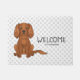 Dessin original de Destei illustrant une jolie couleur de rubis Cavalier King Charles Spaniel chien de race assis. Il y a aussi le texte qui dit maintenant "Bienvenue" avec une zone de texte personnalisable pour un nom de famille ou un autre texte personnalisé. L'arrière - plan a un motif d'empreintes de pattes gris.