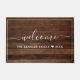 Rustic wood welcome doormat personalized with family name and established year.