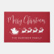 Tapis rouge de saison festif pour votre décor de Noël qui comprend des rennes volant Père Noël traîneau à travers l'air, "Joyeux Noël" dans un script blanc moderne et votre nom dans une simple typographie blanche.