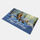 Le tapis de portes avant de vacances amusant la scène de Noël fantasque et surréaliste avec des arbres enneigés, créé avec un logiciel générateur d'IA. Le texte "Happy Holidays" sur arrière - plan bleu est personnalisable.