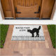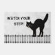 Illustration d'Halloween avec une silhouette d'un chat noir sur une clôture avec un arrière - plan gris/blanc-grunge et un salut, "Regardez votre pas". Décorez votre maison ou votre bureau ce jour de fête d'Halloween avec un tapis de bienvenue personnalisé.