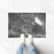 Il s'agit d'un gros paillasson d'impression de nuage foncé cool qui dit 'SUPPRIMER VOS CHAUSSURES AVANT D'ENTRER' en gros caractères blancs. Espérons que tout le monde sera pieds nus dès que vous ouvrirez la porte !