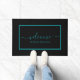 Tapis de bienvenue moderne avec un script turquoise sur un arrière - plan noir. Personnalisez avec votre nom de famille ou votre texte.