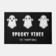 L'illustration de Destei de trois fantômes où ils ont tous une expression faciale différente. Les expressions comprennent un fantôme heureux, un fantôme souriant et un fantôme éffrayant. Il y a aussi deux zones de texte personnalisables. Un exemple de texte dit : "Vibes Éffrayantes" tandis que l'autre a de l'espace pour un nom de famille ou un autre texte personnalisé comme "bienvenue". La couleur arrière - plan est noire, mais elle peut aussi être changée en n'importe quelle autre couleur, si vous le souhaitez. Ce design est une façon amusante d'ajouter un décor d'Halloween éffrayant.