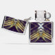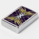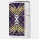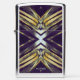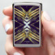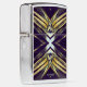 Het originele kunstwerk van ZoeSPEAK op deze Zippo-aansteker is gemaakt van Zoe's originele foto van zaagpalmettotakken. De gouden bladeren buigen naar buiten en komen in het midden samen om een X te vormen in een blauwachtig zilveren kleur. De schaduwen leiden tot een diepe paarse achtergrond. Er is monogramtekst die je kunt personaliseren, of verwijderen als je dat liever hebt.