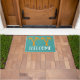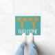 Plage de palmiers Tapis d'accueil à thème été avec palmiers oranges sur le thème de la plage contre arrière - plan bleu personnalisable avec panneau d'accueil. Un tapis de porte de bienvenue à l'ambiance estivale pour votre maison.