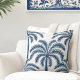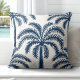 Palmiers bleus et blancs Tropical style côtier Jetez l'oreiller. Idéal pour un séjour maison de plage, maison côtière ou gîte balnéaire. Design créé par la créatrice Totally Coast Jillee K. Copyright © Totally Coast Tous droits réservés 2023