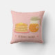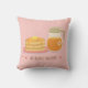 Een roze gooi kussen met een schattige doodle van pannenkoeken en ahornsiroop, het voedsel paar dat perfect samen is. De tekst luidt "We are perfect together!" met twee harten.