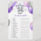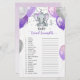 Cette carte de jeu pour bébé traits de douche avec éléphant de bébé violet et gris avec ballons et confettis. Vous pouvez personnaliser le jeu en cliquant sur le bouton "personnaliser". CLÉ DE RÉPONSE : 1. Dehors, 2. Berceau, 3. Rattle, 4. Bouteille, 5. Pacifique, 6. Grossesse, 7. Formule, 8. Teddy Bear, 9 ans. Haut-président, 10 ans. Poussette, 11. Baby Monitor, 12 ans. Rattle, 13. Poudre bébé, 14 ans. Mobile, 15. Pompe mammaire, 16 ans. Blanket, 17 ans. Siège auto, 18 ans. Pleure, 19 ans. Nursery, 20 ans. Crème de couches