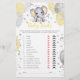 Cette carte de jeu de bébé traits de douche comporte un éléphant de bébé jaune et gris avec des ballons et des confettis. Vous pouvez personnaliser les questions du jeu en cliquant sur le bouton "personnaliser".
