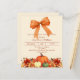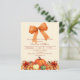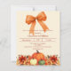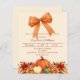 Arrière - plan beige moelleux. Décoré de fleurs citrouilles, orange et jaune et d'un grand arc. Personnalisez et ajoutez les détails de la fête. 1 feuille = 1 invite imprimé bord à bord.