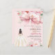 Un élégant arrière - plan rose vif, décoré d'un grand arc rose, de fleurs roses et d'une fille en robe crème. Personnalisez et ajoutez un nom et des détails du parti. 1 feuille = 1 invite imprimé bord à bord.