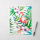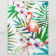 OEuvre d'art à thème tropical d'un flamand rose et de plantes de jungle tropicale verte avec fleurs d'hibiscus et palmiers contre un arrière - plan blanc neutre. Une oeuvre d'art amusante et colorée.