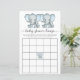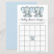 Joli jeu de douche de bingo pour bébés garçons jumeaux avec "baby shower bingo" dans un script gris doux et élégant avec des swashes et une aquarelle bleu pastel d'éléphants jumeaux pour bébés.