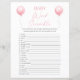 Ce jeu de mots baby shower scramble est parfait pour un baby shower ou un bébé sprinkle. Ce jeu de mots scramble comprend un ballon d'aquarelle rose et un arc mignon. Vous pouvez personnaliser cette conception en cliquant sur "Personnaliser ce modèle" ou si vous souhaitez modifier la police, les couleurs ou organiser les éléments de conception d'une manière différente, vous pouvez cliquer sur "Modifier à l'aide de l'outil de conception". Clé de réponse : 1. Déchets 2. Bassinet 3. Bouteille 4. Crib 5. Pacifique 6. Modification du tableau 7. Animal farci 8. Poussette 9. Caoutchouc 10. Couverture 11. Ensemble 12. Formule 13. Haut président 14. Mobile 15. Thermomètre 16. Bébé 17. Lait 18. Booties 19. 20. Ours en peluche