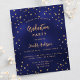 Une carte d'invitation glamour pour une fête de remise de diplômes pour lui et elle. Un arrière - plan bleu marine décoré d'étoiles faux or. La couleur bleue est inégale. Personnalisez et ajoutez un nom et des détails du parti. Le texte Graduation et le nom sont écrits avec un script de style à la main moderne. Texte de couleur dorée. Retour : bleu marine arrière - plan et étoiles d'or. 1 feuille = 1 invite imprimé bord à bord.