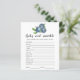 Carte d'invitation baby shower mignonne avec aquarelle illustrant les bleuets. Le texte dit "un bébé doux aux baies est en route." Éléments correspondants disponibles. Réponses : CRAVINGS, PLEIN, PACIFICATEUR, BOUTEILLE, LUMIÈRE NOCTURNE, LULLABY, STROLLER, ÉPIDURAL, BRÛLE, CHAISE HAUTE, SAC DE DIAPER, ÉPONSE