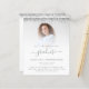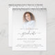 Un rapport qualité-prix BUDGET alternative sur une taille plus petite 4,5 x 5,6" semi-brillant poids 110lbs, qui est d'une épaisseur similaire à une carte postale (cependant ne convient pas à l'utilisation comme carte postale.) VEUILLEZ NOTER qu'il y a UN par feuille. Budget 2022 Graduation Photo Silver Parties scintillant Party Invitation. Les bordures de parties scintillant en argent glam sont au sommet des deux côtés. Le diplômé est dans un script élégant avec des swashes. Personnalisez facilement le texte selon vos besoins et remplacez l'exemple d'image par le vôtre. Pour conserver l'aspect contemporain minimaliste de ce design, une photo avec un arrière - plan de couleur claire fonctionnera bien.
