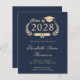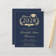 Convivial pour le budget moderne, l'invitation à la fête de remise des diplômes de l'université bleu marine foncé avec "Classe de" dans une illustration dorée d'une couronne de laurier incorporant un haut casquette et un diplôme et le nom du diplômé dans un élégant script d'or clair. Ajoutez leur école, major, distinctions honorifiques ou plans d'avenir et les détails du grand parti en typographie or simple.