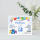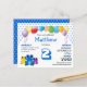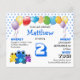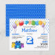 Invitation à la fête d'anniversaire d'un mignon garçon bleu budget, montrant un trio de grenouilles aux yeux larges vibrants et une gamme de ballons colorés. Sur le devant, vous pouvez customiser le nom et l'âge de l'enfant, ainsi que la date, les détails rsvp et le lieu. L'arrière - plan comprend un motif moderne carrelé en bleu, qui est lié à l'âge principal, et ce motif est répété à l'envers. Tout ce que vous devez faire est de changer le numéro une fois, et il va automatiquement changer le motif. (Il s'agit d'invitations budgétaires de bonne qualité, alors n'oubliez pas d'ajouter des enveloppes et/ou de transférer la conception au stock de carte si vous préférez.) Cette invitation serait idéale pour tous les enfants qui aiment les grenouilles et les ballons colorés et aux yeux larges. D'autres variantes sur ce thème sont disponibles.
