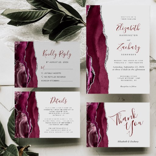 Papier Budget Burgundy Silver Agate Gray Wedding Invite