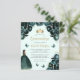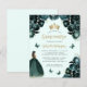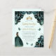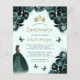 Cette jolie invitation de quinceañera comporte une bordure de fleurs vert émeraude sur un arrière - plan vert pâle. Une tiara dorée, une fille aux cheveux foncés en robe de princesse vert émeraude et de petits papillons verts ornent le texte. Le mot "Quinceañera" et le nom de l'invité d'honneur apparaissent dans un élégant script d'écriture manuscrite de couleur or, avec le texte restant en gris sans serif.