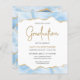 Cette invitation à la fête de graduation branchée présente une bordure supérieure et inférieure de géode d'aquarelle dans les tons bleu clair avec des reflets de parties scintillant en faux or. Le mot "Graduation" apparaît dans la parties scintillant en faux or dans la police décorative moderne d'écriture manuscrite. Customisez l'invitation avec le nom du diplômé en texte couleur or et les détails du parti en gris fusain sur un arrière - plan blanc. Une image d'agate en bleu clair et or correspondant apparaît à l'envers.