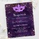 Pour une élégante mascarade, Quinceañera, 15e anniversaire. Un motif arrière - plan violet. Décoré de poussière de parties scintillant en faux or rose et d'un masque masqué. Personnalisez et ajoutez un nom, ainsi que les détails du parti. Le nom est écrit avec un script de style manuscrit