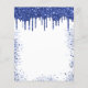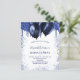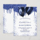 Une invitation à la fête d'anniversaire féminine et féminine. Devant : Un arrière - plan blanc. Décoré avec des gouttes de parties scintillant bleu marine, l'apparence de la peinture goutte à goutte et des ballons. Personnalisez et ajoutez un nom et des détails du parti. Le nom est écrit avec un script de style écrit à la main.