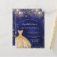 Une invitation branchée et glamour pour une Quinceañera, 15ème anniversaire. Un arrière - plan bleu marine avec de la poussière de parties scintillant en faux or et une robe. La couleur bleue est inégale. Le nom est écrit avec un script de style moderne écrit à la main. Personnalisez et ajoutez les détails de votre fête.