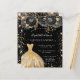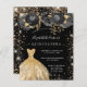 Une invitation moderne, élégante et glamour pour une Quinceañera, 15ème anniversaire. Un arrière - plan noir avec de la poussière de parties scintillant fausse or, une robe et des roses noirs et or, des fleurs. Le nom est écrit avec un script de style moderne écrit à la main. Personnalisez et ajoutez les détails de votre fête.